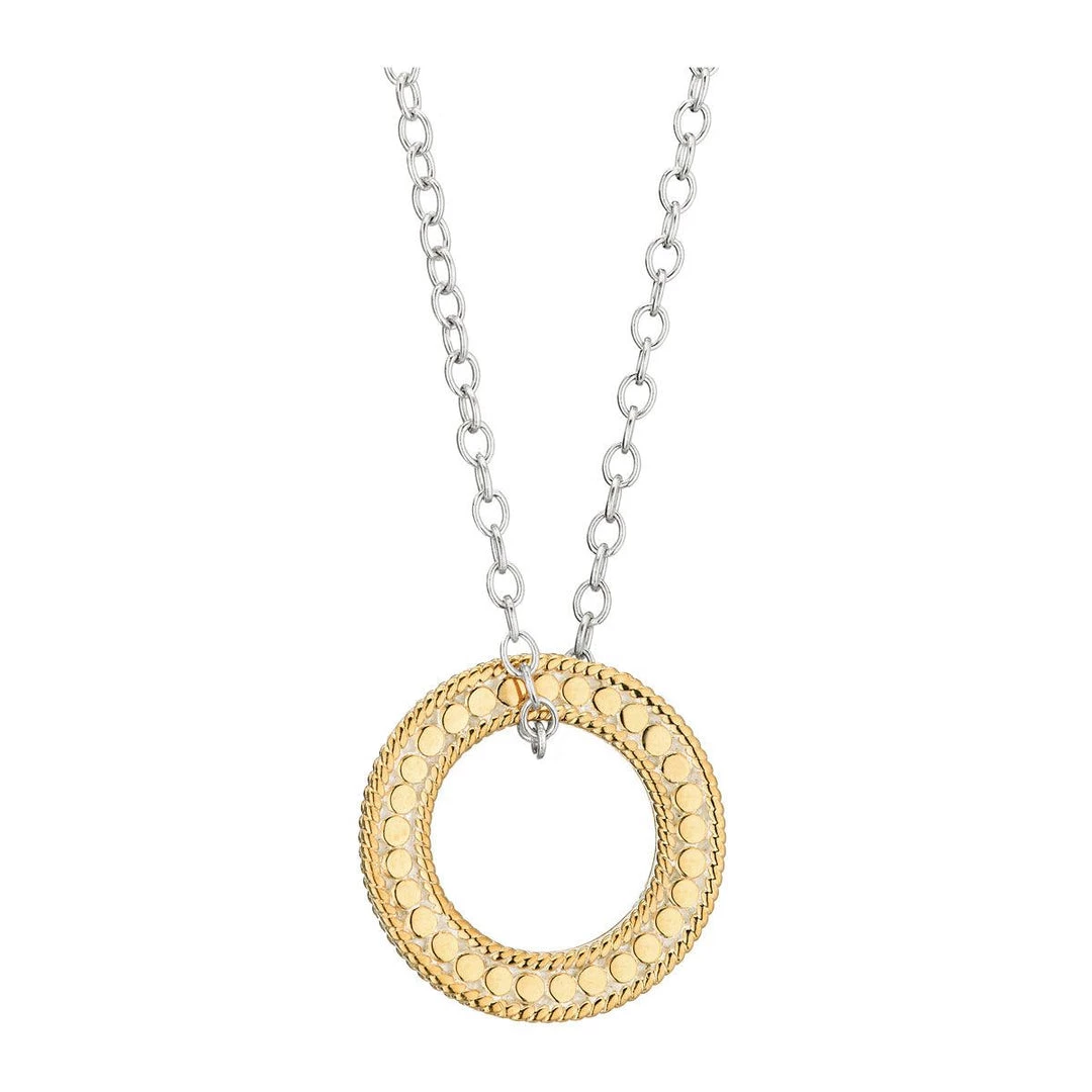 Wire-rimmed gold-plated open “O” Circle of Life necklace on 16″ to 18″ adjustable silver chain. Handmade in Bali.