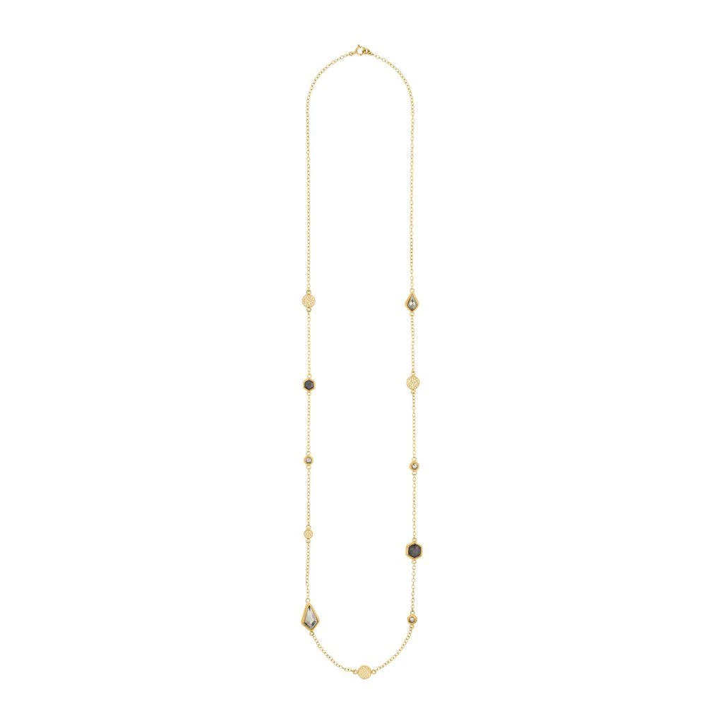 Gold plated grey sapphire and pyrite multi-disc station necklace on 36″ gold chain. Handmade in Bali.