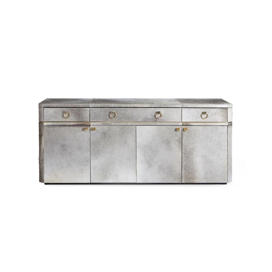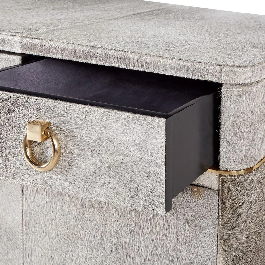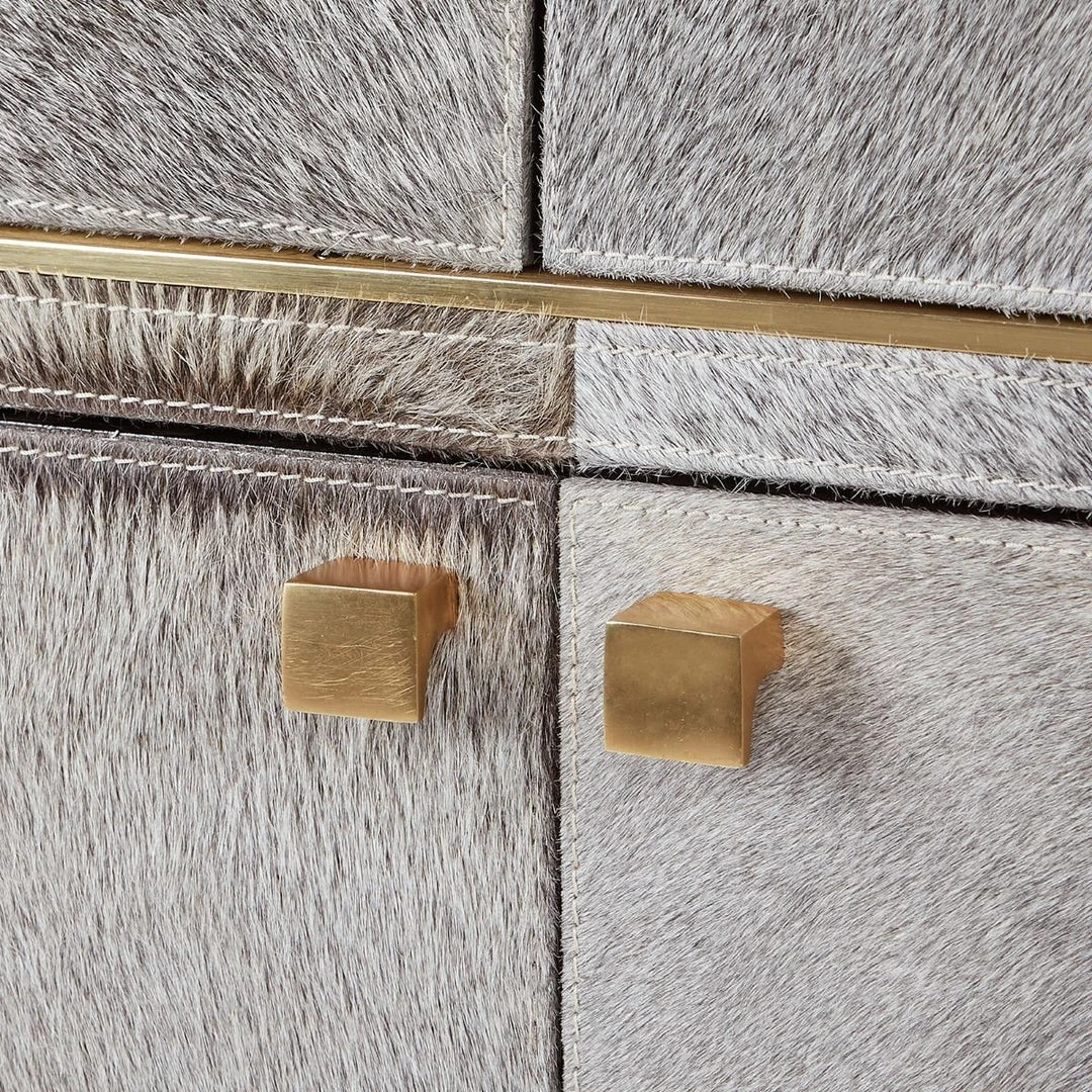 A delightfully surprising expression of luxury, our 4-Door and 3-Drawer Andre Cabinet boasts a plush gray hair-on-hide surface that begs to be noticed—and endlessly caressed. Its uniquely tactile features continue throughout, with rich micro-suede covering the interiors of its soft-closing drawers and adjustable shelving. Though its neutral tones ensure ultimate versatility, the Andre distinctly communicates glamour thanks to its Art Deco silhouette and polished brass hardware. Boasting plenty of storage space, it makes an elegant addition to a living room, bedroom, or out-of-the-ordinary office.