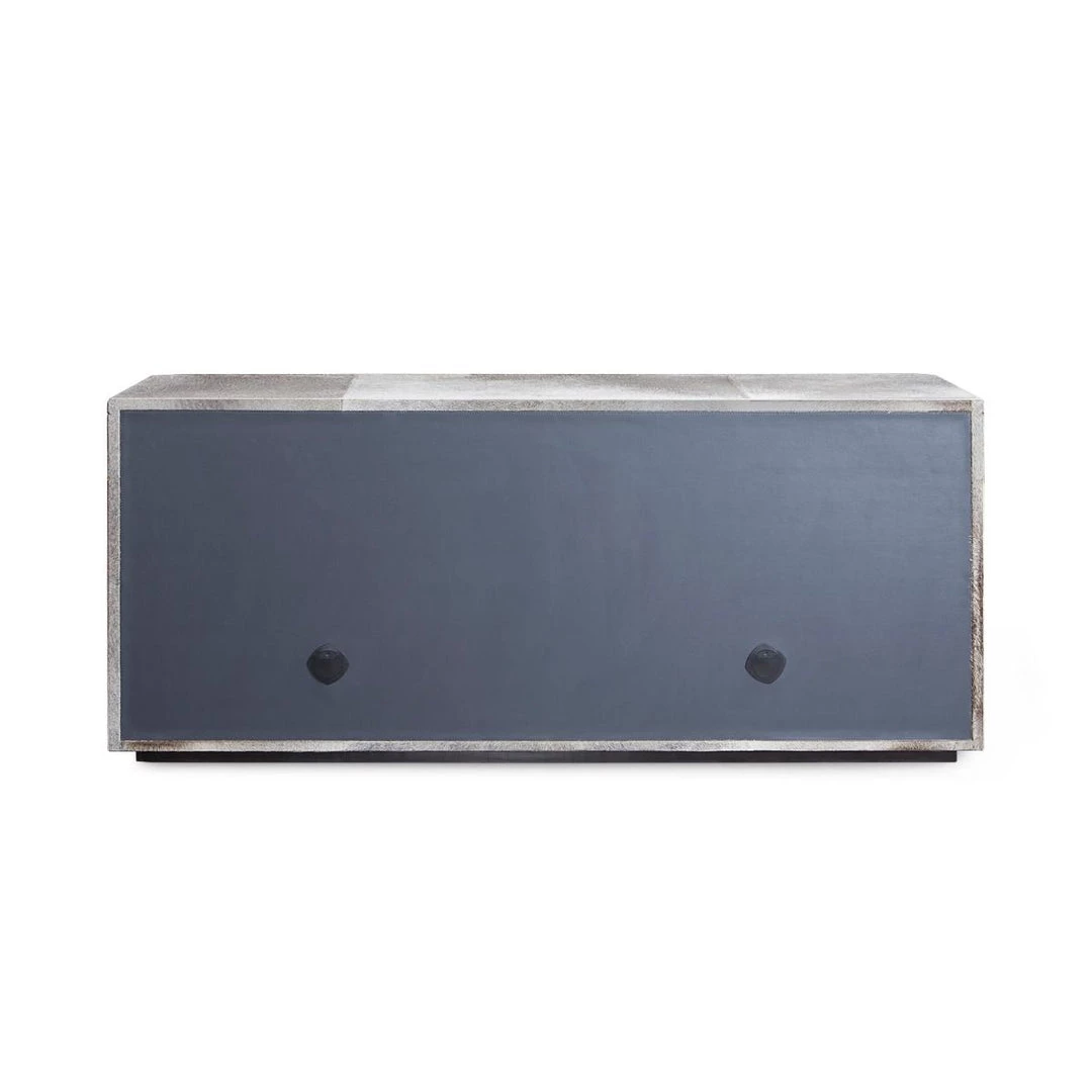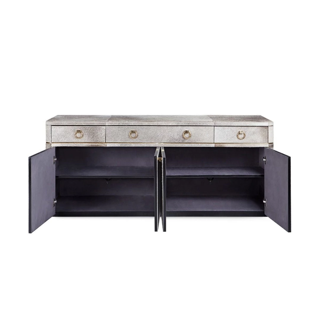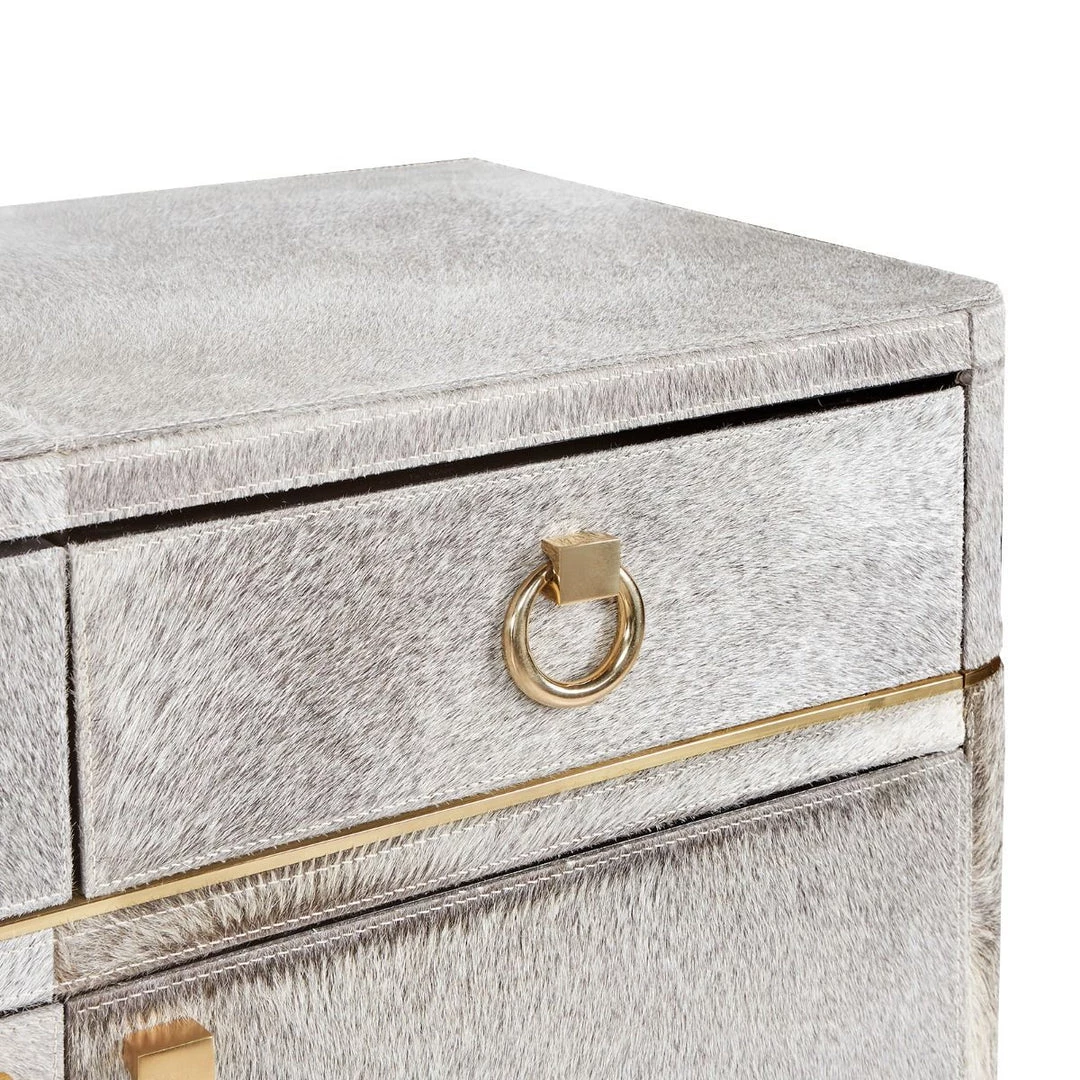 A delightfully surprising expression of luxury, our 4-Door and 3-Drawer Andre Cabinet boasts a plush gray hair-on-hide surface that begs to be noticed—and endlessly caressed. Its uniquely tactile features continue throughout, with rich micro-suede covering the interiors of its soft-closing drawers and adjustable shelving. Though its neutral tones ensure ultimate versatility, the Andre distinctly communicates glamour thanks to its Art Deco silhouette and polished brass hardware. Boasting plenty of storage space, it makes an elegant addition to a living room, bedroom, or out-of-the-ordinary office.