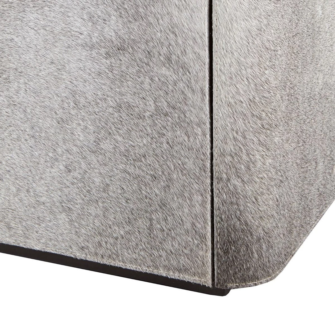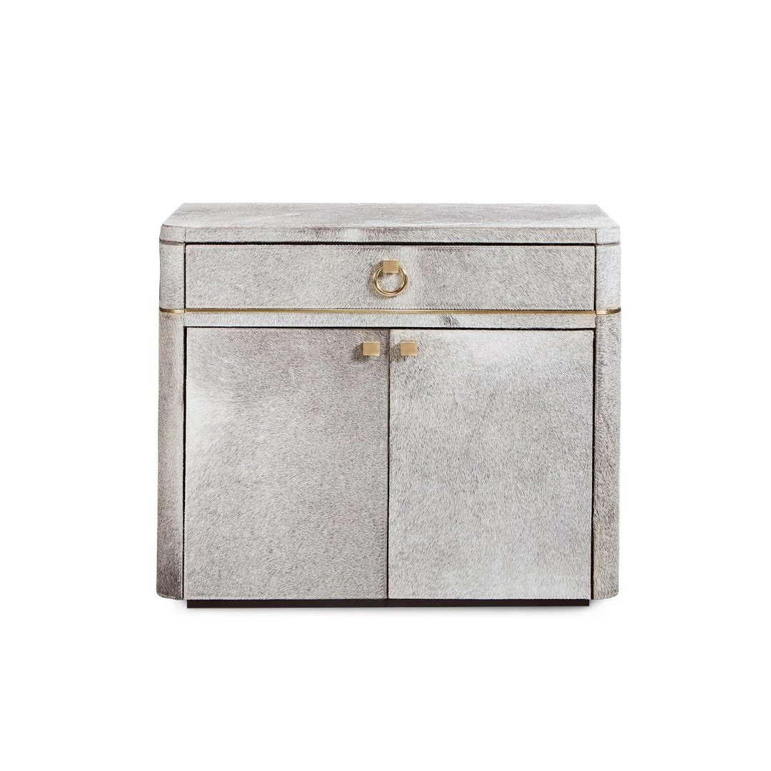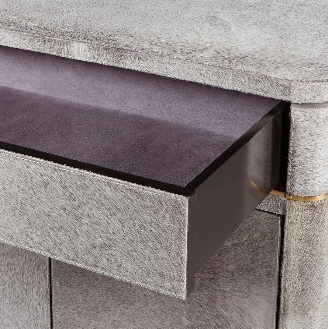A delightfully surprising expression of luxury, our Andre Cabinet boasts a plush wrapped gray hair-on-hide surface that begs to be noticed—and endlessly caressed. Its uniquely tactile features continue throughout, with rich micro-suede covering the interiors of its soft-closing drawer and adjustable shelving. Though its neutral tones ensure ultimate versatility, the Andre distinctly communicates glamour thanks to its Art Deco silhouette and polished brass hardware. It makes an elegant addition to a sitting area, bedroom, or out-of-the-ordinary office.