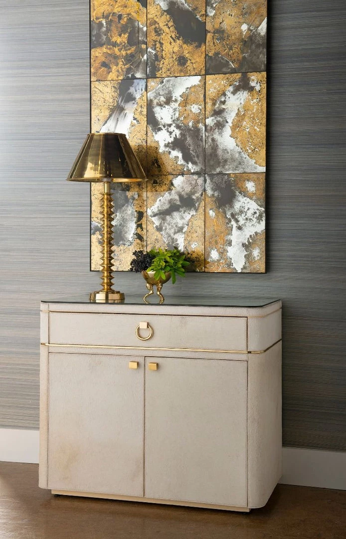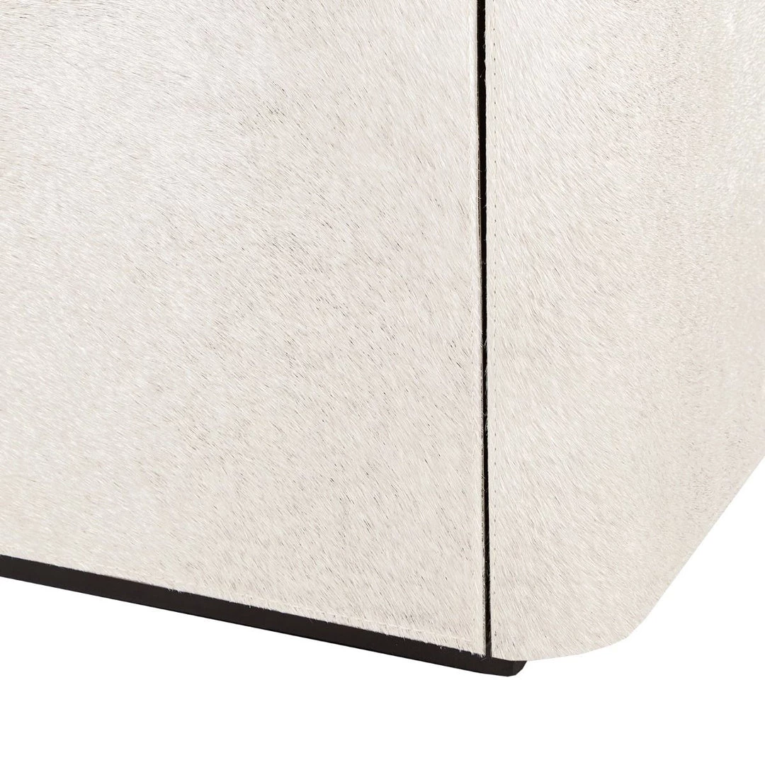 A delightfully surprising expression of luxury, our Andre Cabinet boasts a plush white hair-on-hide surface that begs to be noticed—and endlessly caressed. Its uniquely tactile features continue throughout, with rich micro-suede covering the interiors of its soft-closing drawer and adjustable shelving. Though its neutral tones ensure ultimate versatility, the Andre distinctly communicates glamour thanks to its Art Deco silhouette and polished brass hardware. It makes an elegant addition to a sitting area, bedroom, or out-of-the-ordinary office.