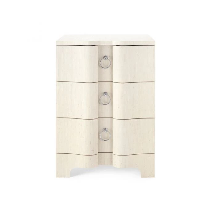 The Bardot Collection is a curvy, Art Deco-inspired design with a serpentine-front profile that imparts a sense of movement and fluidity. The lacquered grass cloth has been expertly applied by our skilled artisans so that it flows seamlessly over each cresting drawer front and around each corner. This piece appeals to those who want polished, decorated rooms.