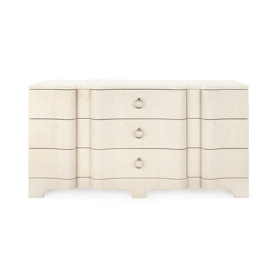 The Bardot Collection is a curvy, Art Deco-inspired design with a serpentine-front profile that imparts a sense of movement and fluidity. The lacquered grass cloth has been expertly applied by our skilled artisans so that it flows seamlessly over each cresting drawer front and around each corner. This piece appeals to those who want polished, decorated rooms.