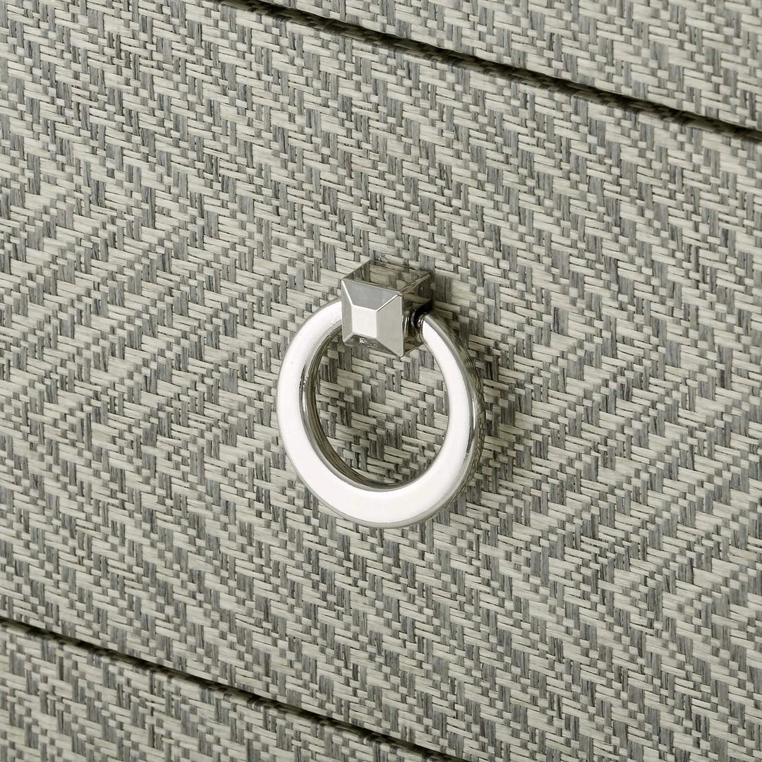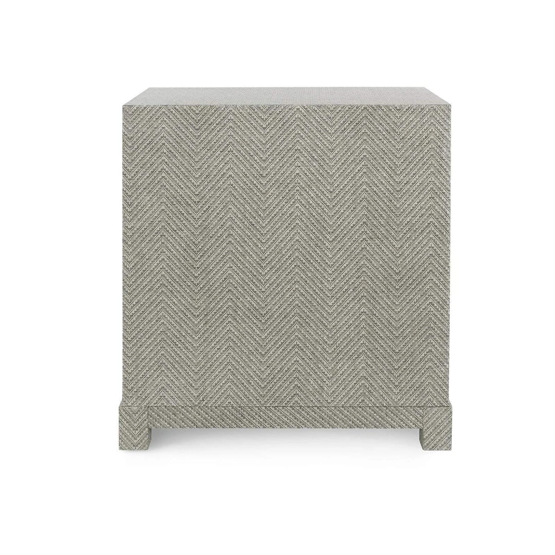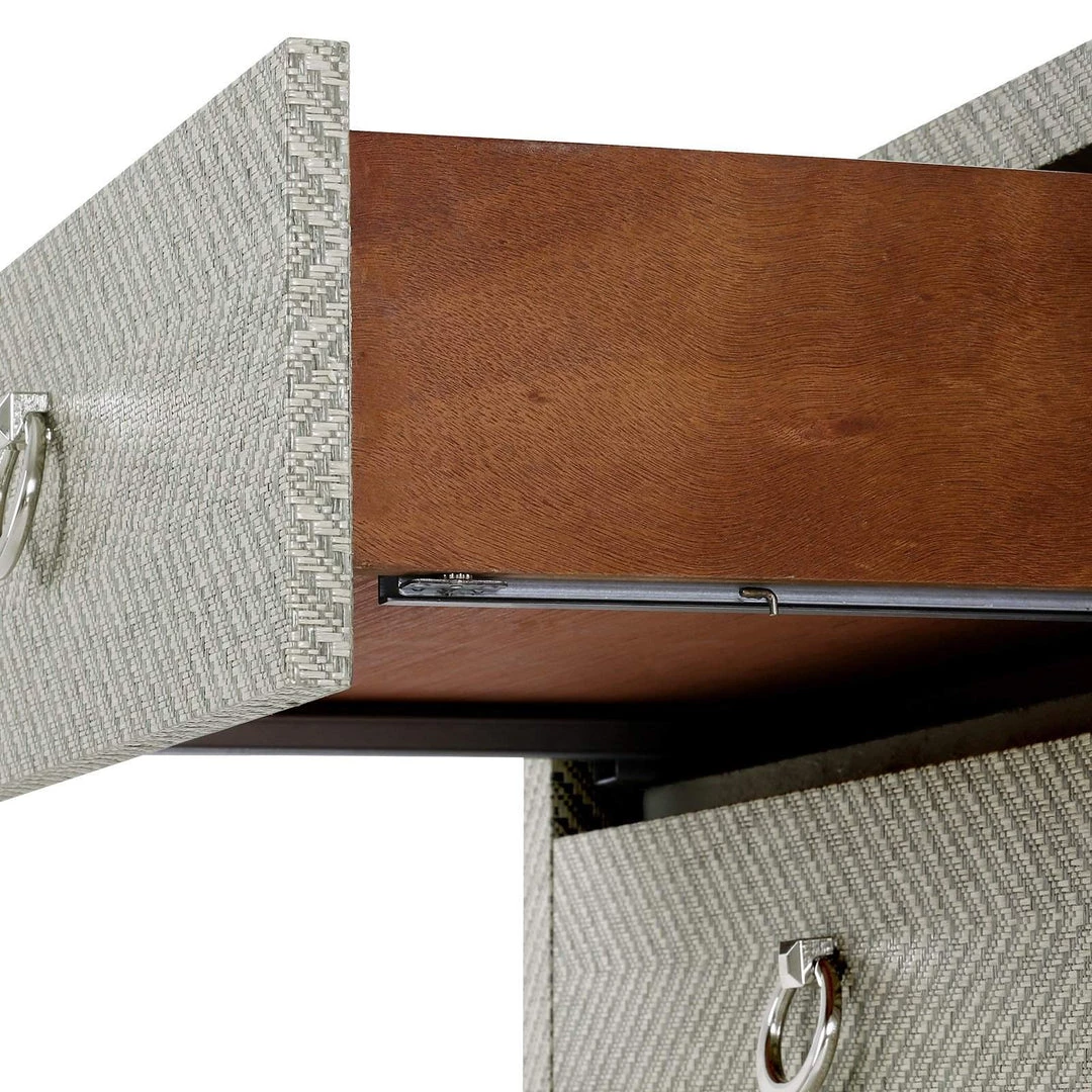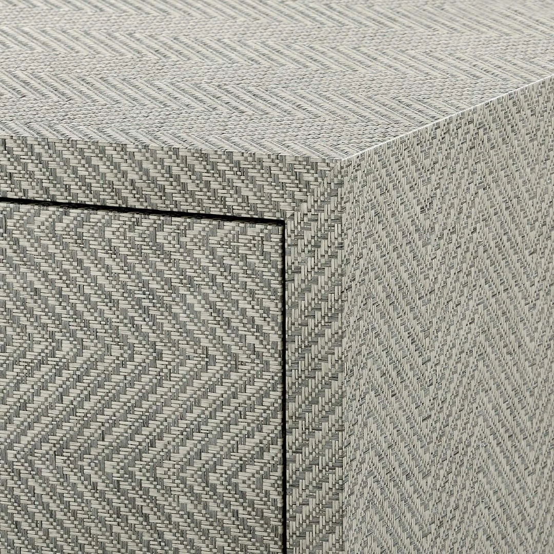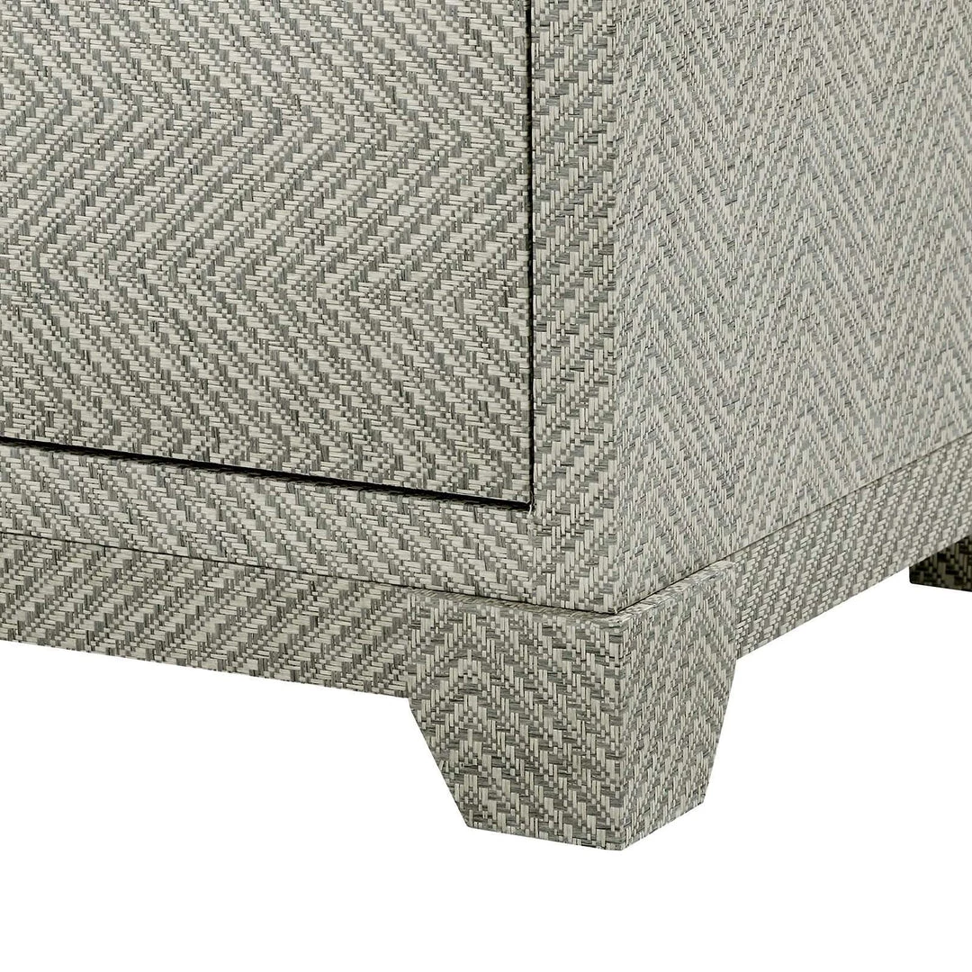 - Lacquered Tweed Chevron Grasscloth, Stained Interior with Soft-Closing Glides, Polished Nickel Handle.
