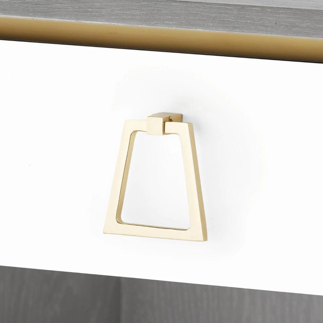 The Cameron Collection unites many unique design features into an elegant and inspired presence for the home. The oak veneer cabinet houses lacquered drawers and doors which are framed in glittering polished brass. The matching pulls and accents are customizable: choose your shape and make it perfect.