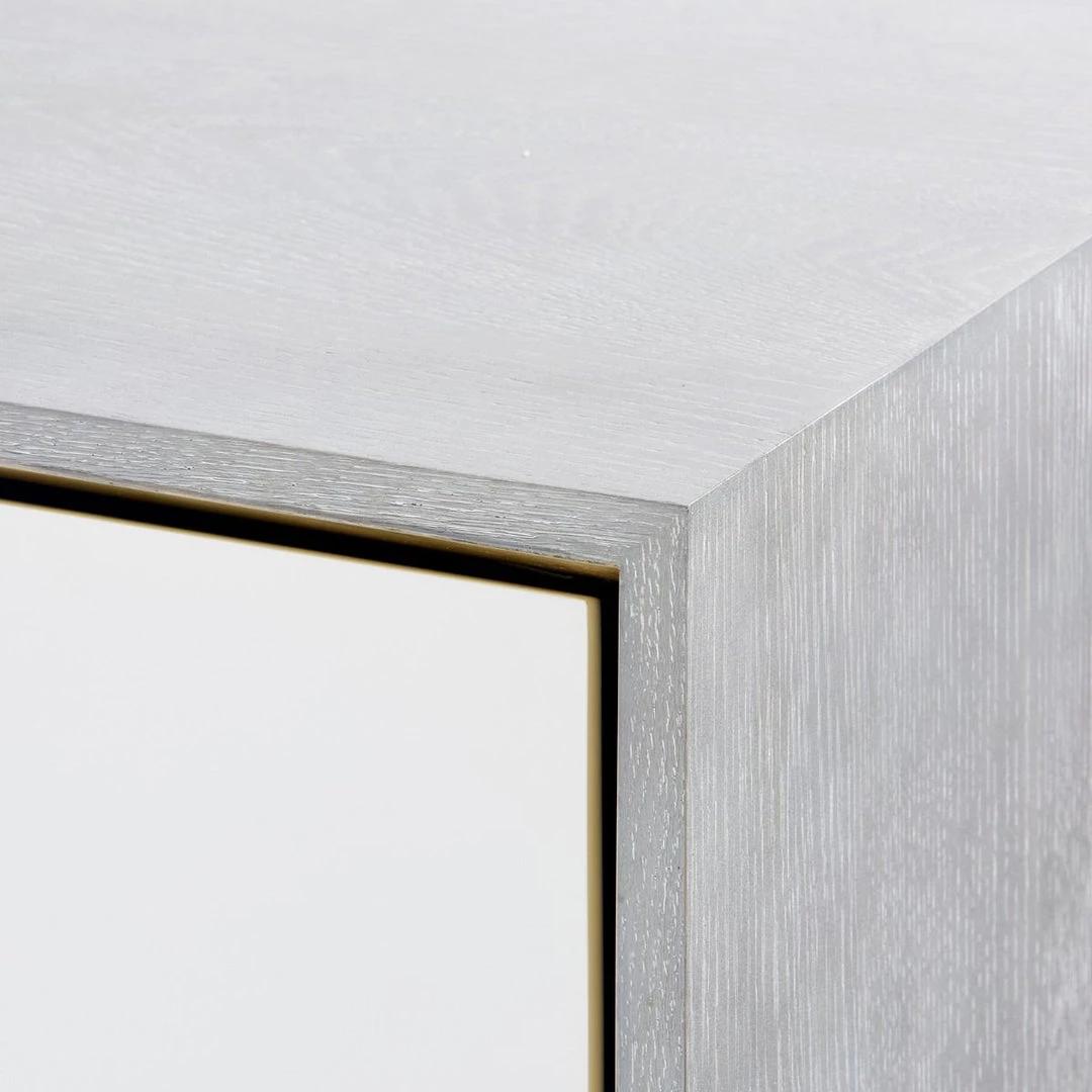 - Gray Washed Oak Veneer, White Lacquer Drawer, Polished Brass Accents