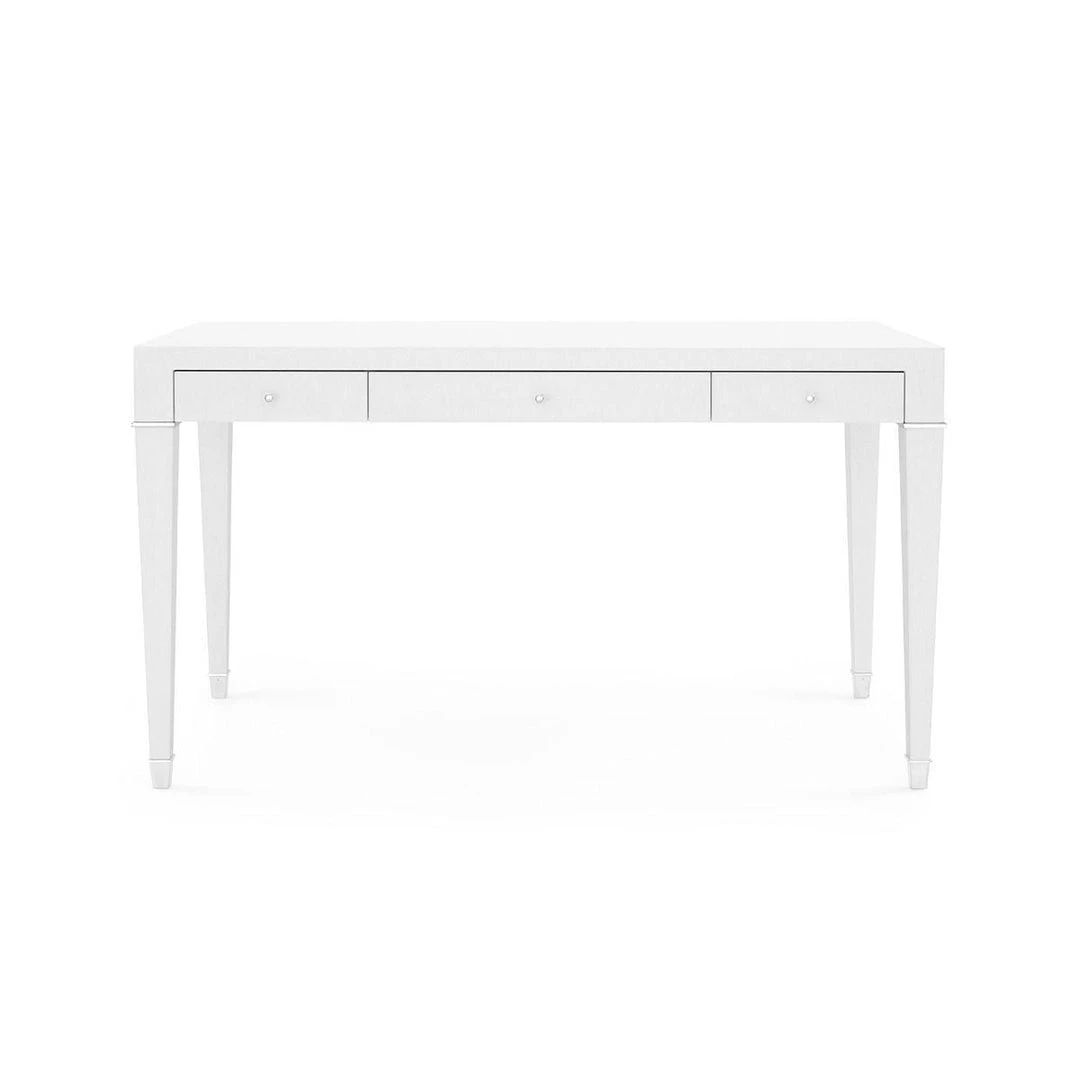 An ideal example of Bungalow 5’s signature use of unique finishes, the Claudette Collection is instantly eye-catching thanks to the look of its washed lacquered linen. At once both sophisticated and fresh, the material has been meticulously draped over the structured, modern form of the Claudette Desk, providing a touch of texture to its sleek, clean lines. Its soft white color finds modern accents in the custom cast brass or nickel pulls and set of sabots on its legs. Svelte proportions add to its upscale feel in a sitting room, study, or bedroom, with three floating drawers of alternating length providing hide-away storage for documents, office supplies, and more.