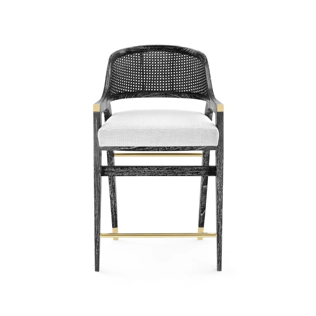 With the Edward Collection, our craftsmen have taken a classic shape and energized it using fresh mixed materials. The result is a complementary selection of seats which all make a sophisticated impression with an air of casual cool. Here, the Edward Counter Stool cuts a fine figure in Cape Lilac Mahogany, with a black finish that boldly underscores the natural grain of the elongated wooden frame. Its back boasts a screen of lacquered hand-tied caning, with a form-fitting curve to ensure ultimate comfort. Metallic accents speak to our artisans’ eye for detail, with hand-cast brass stretchers, sabots, and armcaps providing a luxurious finish touch. The Edward is an ideal choice for a kitchen island dining set, and would fit well in anything from an urban loft kitchen to a modern farmhouse scheme.
