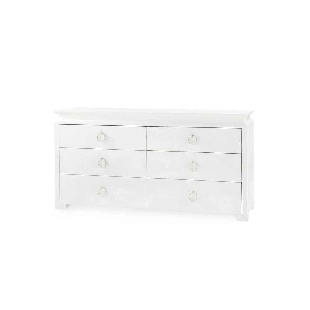 Hand-wrapped lacquered linen brings a modern, luxurious feel to the Elina Extra Large 6-Drawer Dresser. This piece is as much at home in a living room, a bedroom, or an entrance gallery. Six drawers provide ample storage and a large flat top offers plenty of space for home decor like flowers or candles. The curved chow feet, our modern take on classical Chinoiserie, brings a whimsical and exotic feel to this piece.