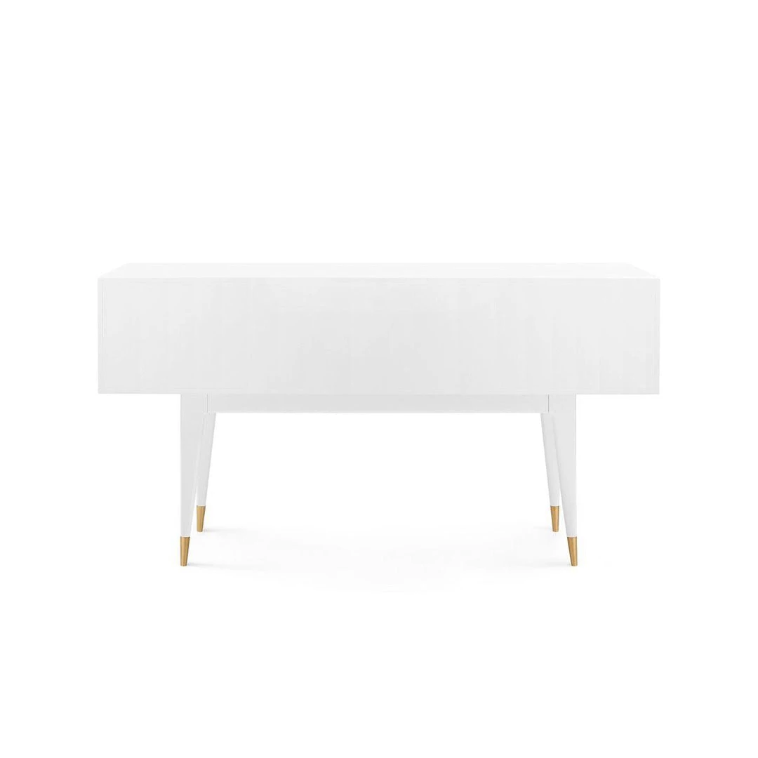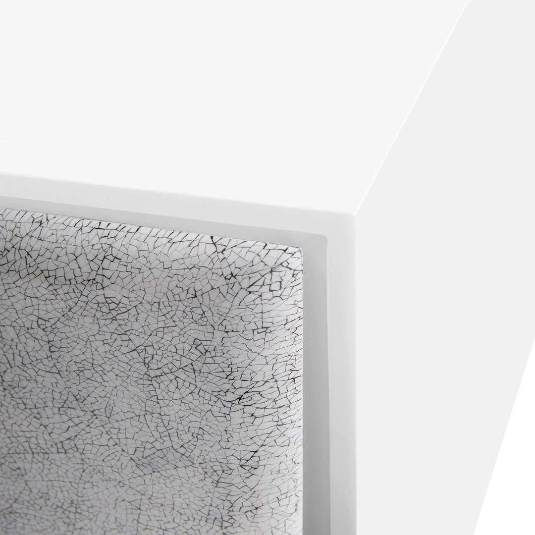 Unmistakably glamorous, the Elisa eggshell console is a showstopper. The collection features rounded drawer fronts covered in pattern eggshell, and large brushed brass handles seem to hover above the angular lines of the side table’s body. There is nothing subtle about the Elisa collection. The eggshell finish on the three drawers is created by an artisan using an old-world technique in which he lays, by hand, tiny pieces of eggshell into a unique pattern over a linen foundation. Each piece of the eggshell is meticulously adhered, fitting in like a puzzle piece. The artisan then covers the design with myriad layers of hand-painted lacquer to achieve a smooth finish. The result is a usable piece of artwork.