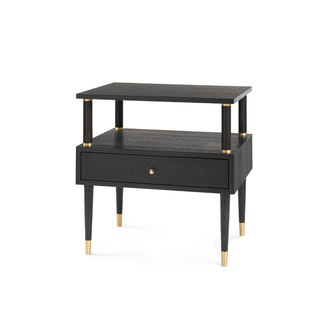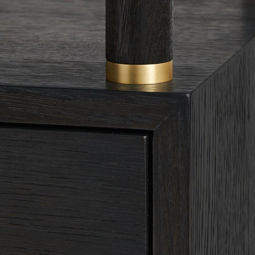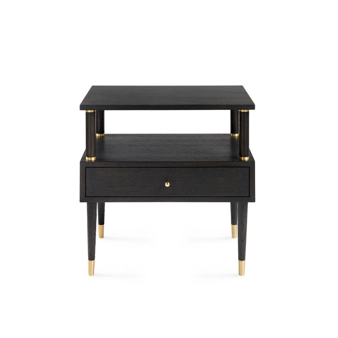 Brushed brass sabots and metal accents add an air of sophistication to this chic side table. Available in Espresso for a modern, avant garde feel, or in bleached cerused oak for a light, bright relaxed feel. This piece is as much at home as an end table, a night stand, or a drink table artfully placed between two chairs. The inclusion of an open shelf and a drawer provide ample organization and storage space for books, magazines, or home decor. The metallic accents are hand-cast in custom molds and placed with precision, giving you the tailor-made feel that can only be achieved through thoughtful attention to detail.