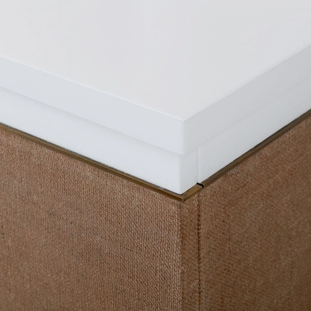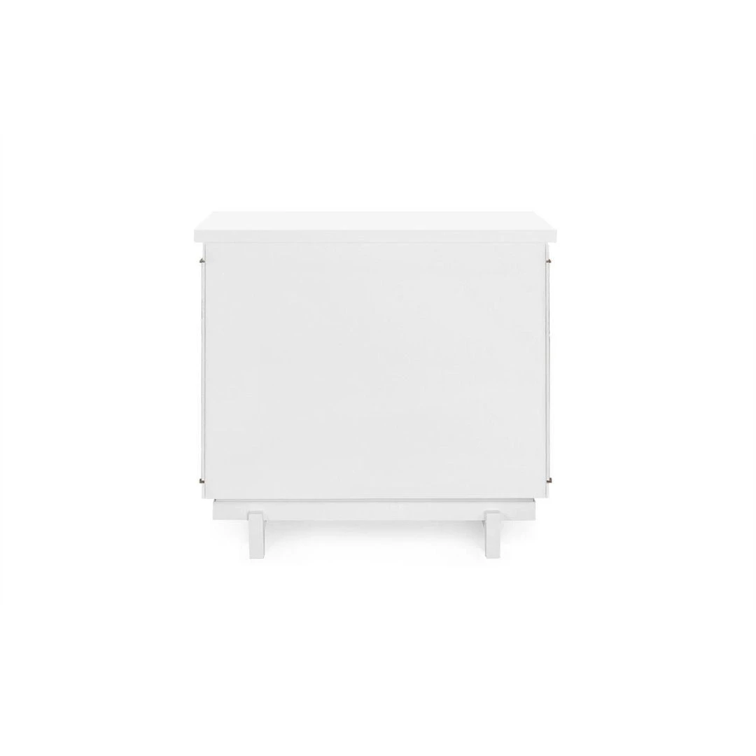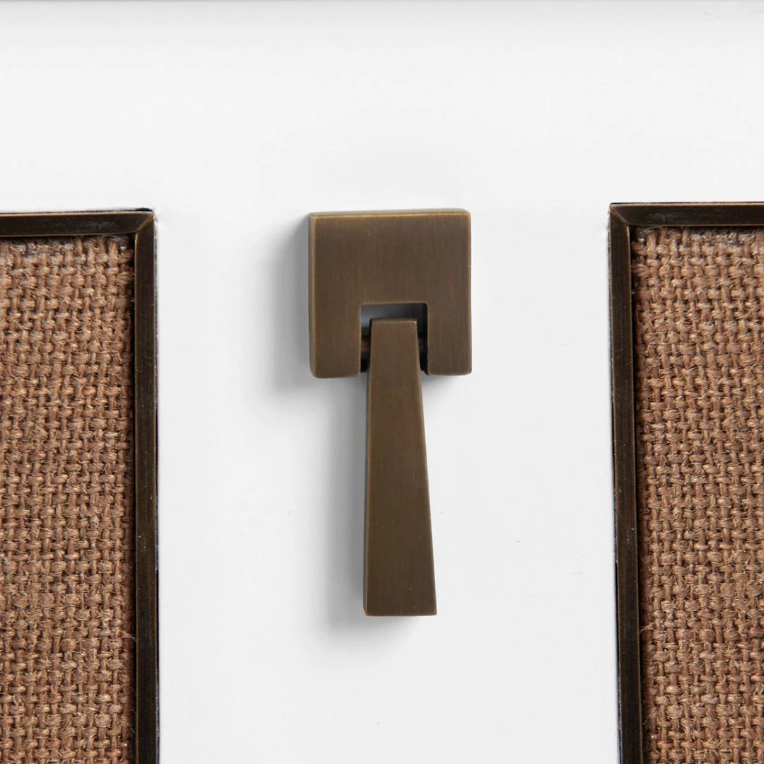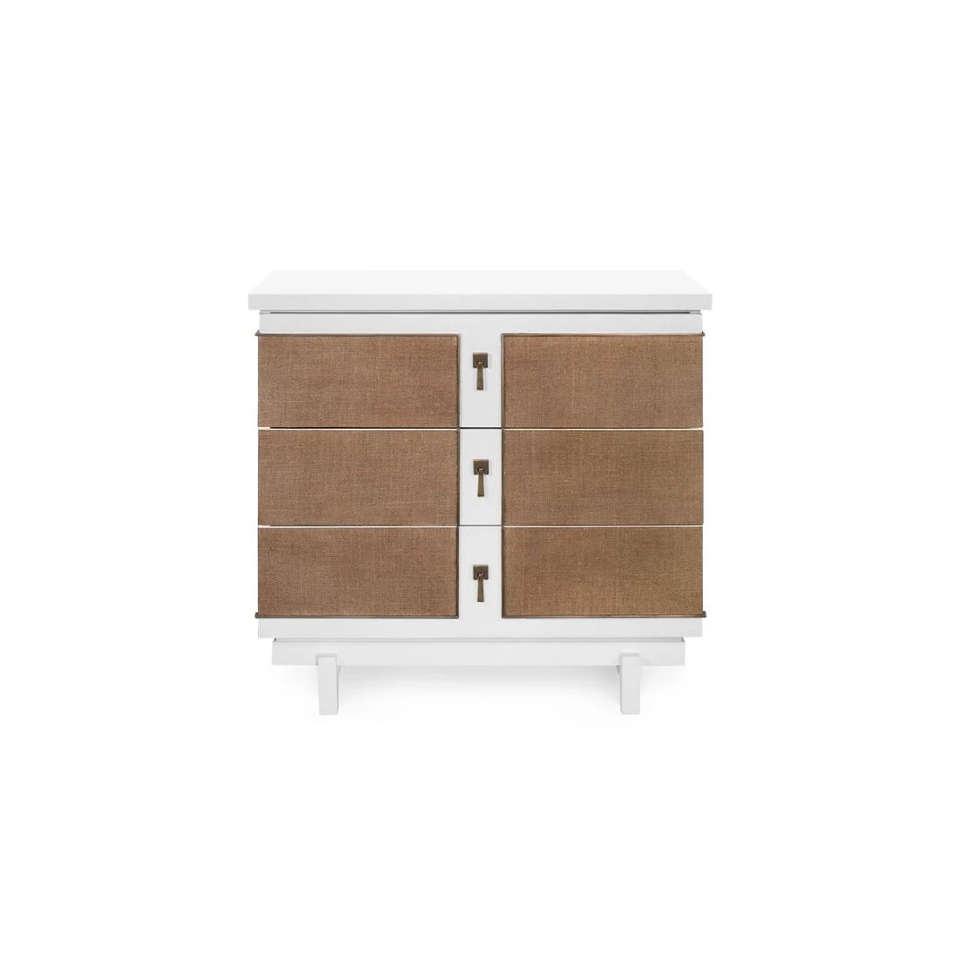 With high-end white lacquer, wrapped hessian panels, and signature Bungalow 5 bronze accents, the 3-Drawer Side Table in the Grant Collection is a standout. Reminiscent of Frank Lloyd Wright’s design ethos merged with an abstract aesthetic, the Grant Collection is packed with luxury details. Notice the custom hand-cast pulls in a dramatic teardrop shape and the bronze piping that traces the perimeter of the white-washed hessian panels on both the front and sides of the side table. The drawers are finished on the interior with oak veneer and feature soft closing glides. The feet, slightly obscured from view, are comparable to the eaves of a midcentury modern roof, grounding the piece. This white side table would be appropriate in a large bedroom, per its slightly oversized dimensions, or in a dining room as a serving cabinet or bar cart equivalent.