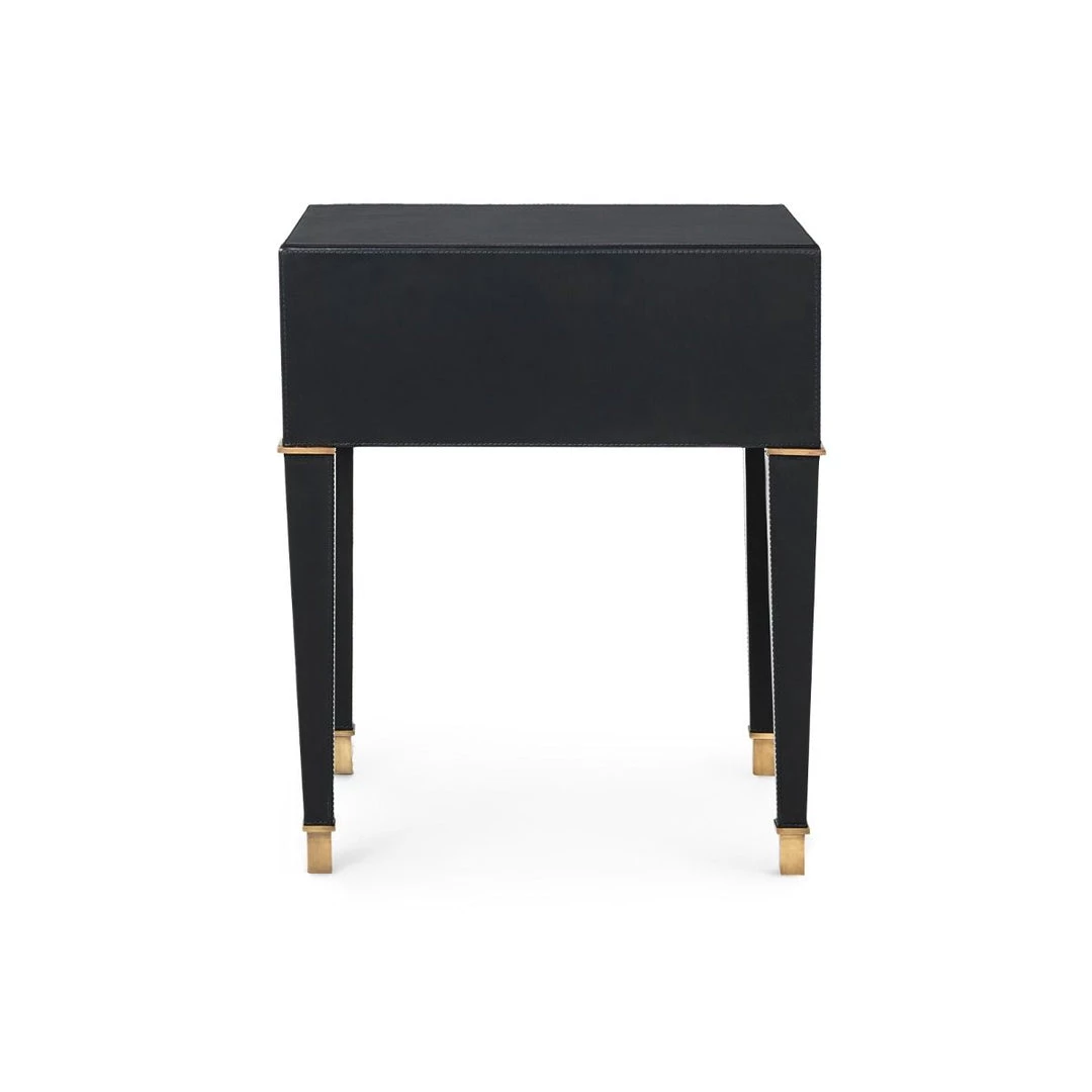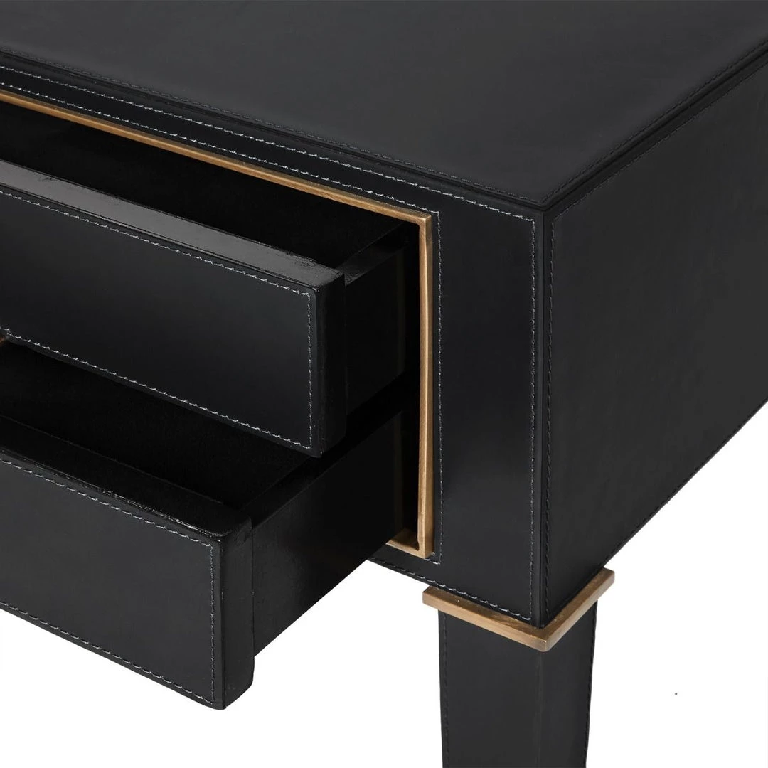 Bungalow 5’s signature use of rich materials and fine craftsmanship is on full display in the Hunter Collection. Our Hunter 2-Drawer Side Table is outfitted in lush black leather and antique brass, elevating its neo-classical silhouette to luxurious new heights. A pair of inset drawers meet at their pulls, gently gliding open to reveal sumptuous micro-suede interiors, the same you might find within an expensive jewelry box. Visible stitching in the leather gives the piece a distinguished and distinctly Americana sophistication, all pulled together by thoughtfully-placed custom brass accents. The Hunter is an ideal pick for a posh study, bedroom, or sitting room rooted in classic luxury.