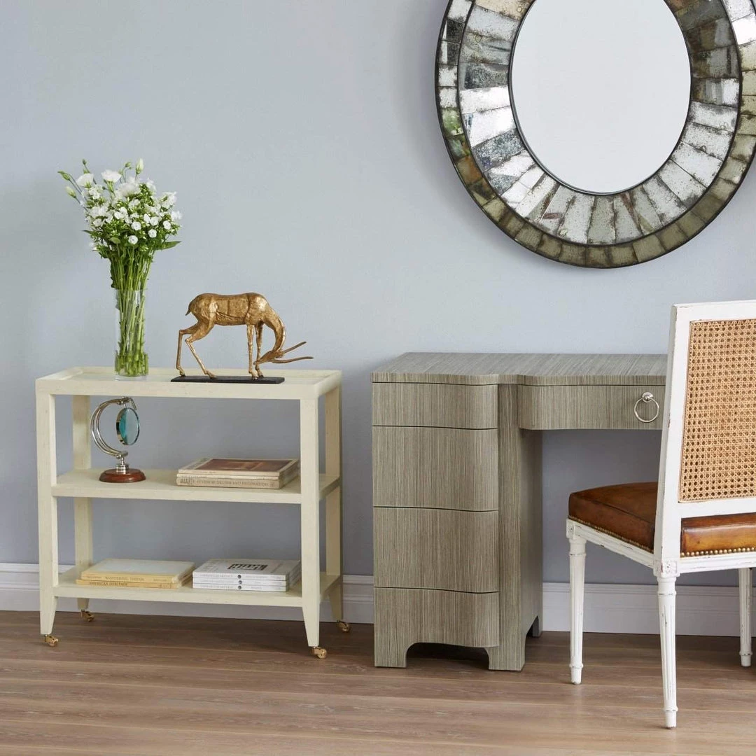 - Lacquered Grasscloth, 2 Fixed Shelves, Brass Castors.