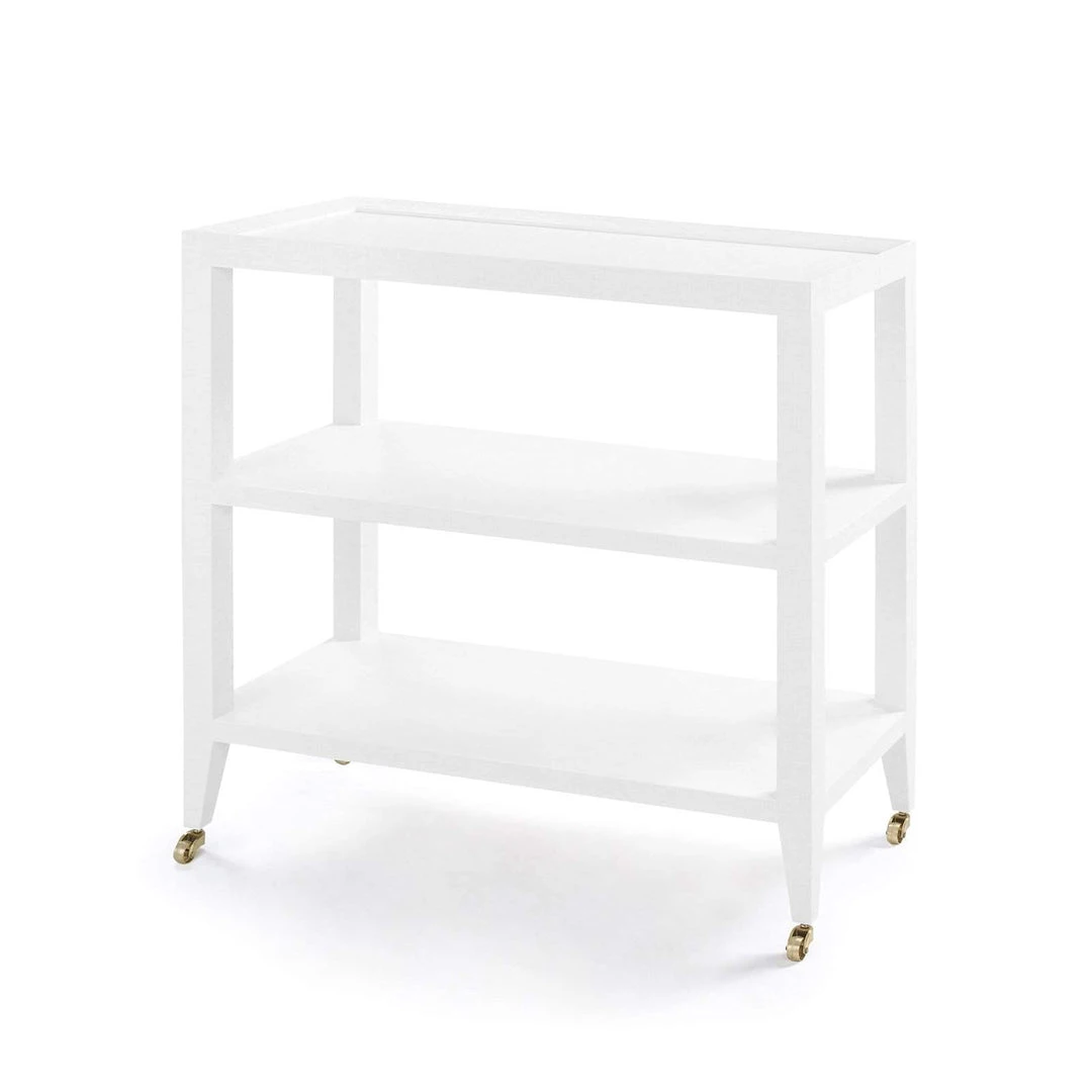 - Lacquered Grasscloth, 2 Fixed Shelves, Brass Castors.