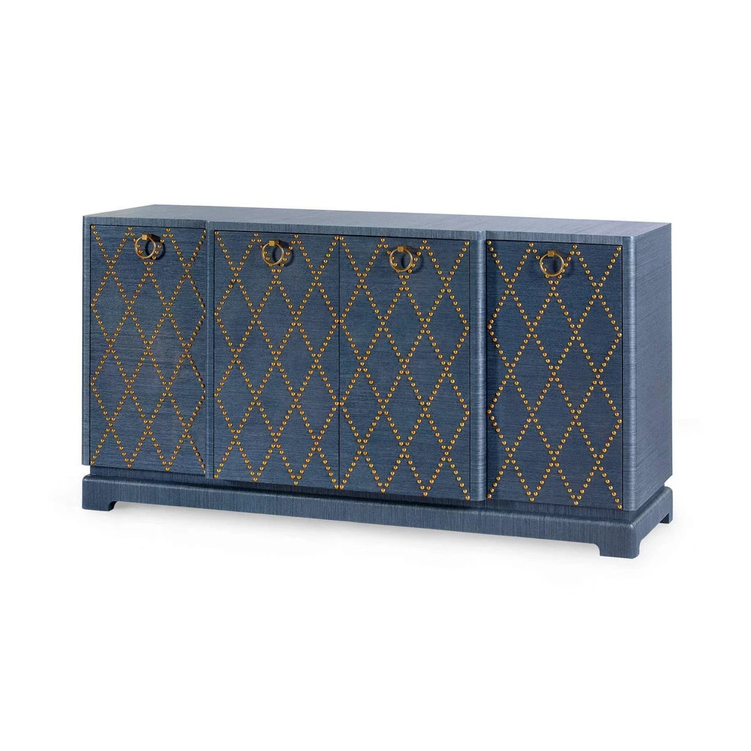 The Janak, large 4-door cabinet is a super-glamorous, high-style design that bridges Bauhaus principles and mid-century styling to create a craft intensive version of Hollywood Regency. The design features colored, textured grasscloth sheathing and a shaped top with two central doors that emerge to break the long surface with pretty dimension and matched, diamond patterned nail heads.