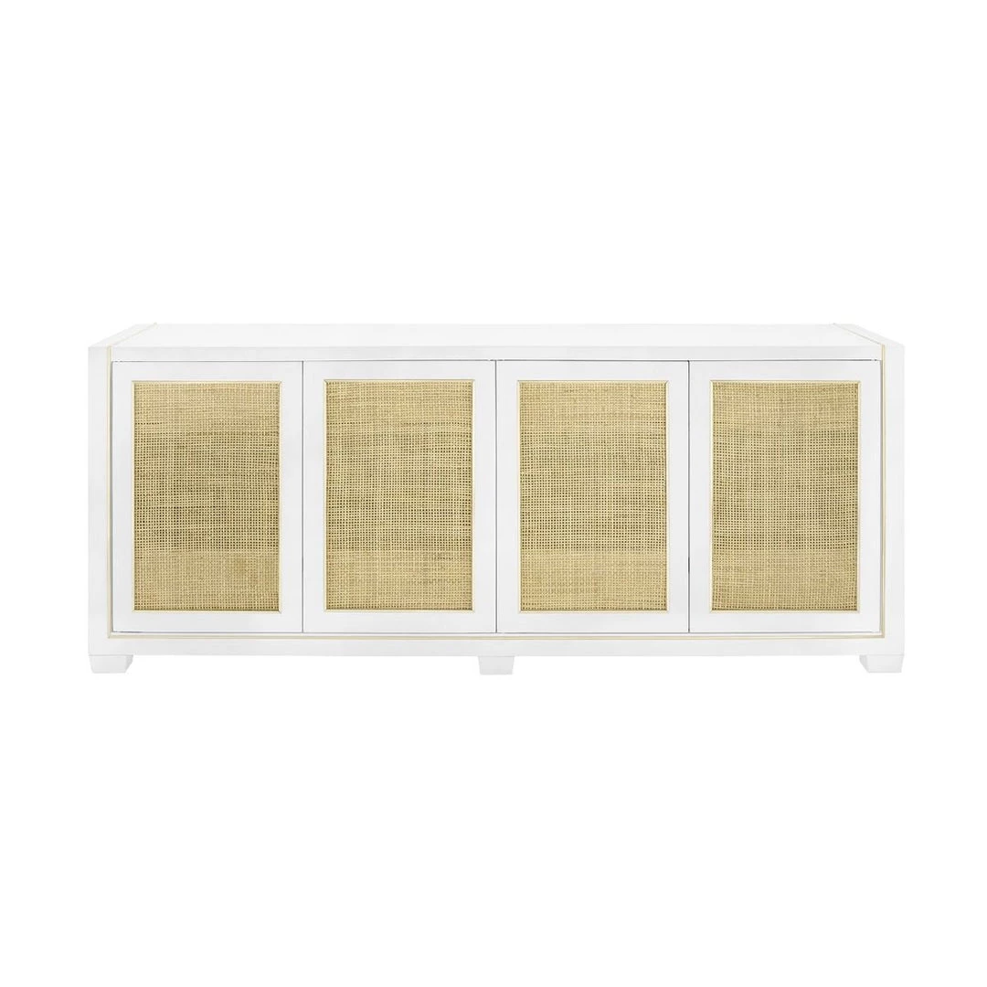 - White Lacquer With Bleached Cane Front Panels, Stained Interior With Touch Latches, Pivot Hinges And Soft Closing Glides, 4 Drawers Inside Cabinet, Polished Brass Accents, Back Features Holes For Cable Access