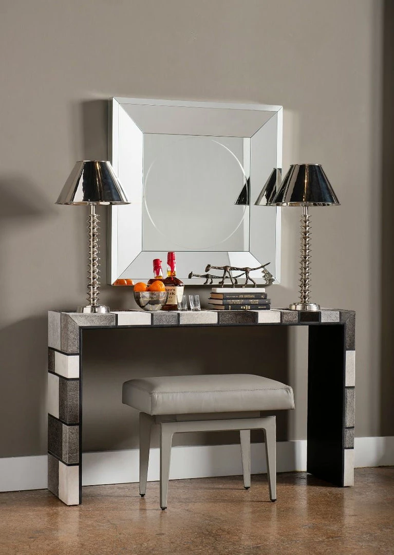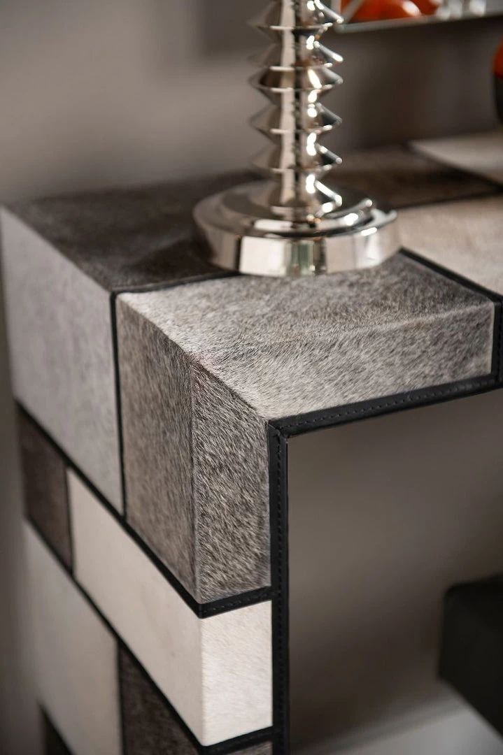 Modern art meets luxurious design.The Mondrian Console is inspired by the iconic works of Piet Mondrian, reimagining the geometric grids of his paintings in plush hair-on-hide. The sumptuously tactile patches are stitched together in a bold, bricklike pattern, colored in varying shades of gray for a strikingly contemporary look. Its sleek and sharp silhouette is softened by its unique materials, including an underside richly draped in soft black felt. Surprising textures, innovative craftsmanship, and an artful aesthetic make the Mondrian a truly stand-out furnishing that radiates upscale glamour. Allow it to add a pop of visual interest in a minimalist decor scheme, or play up its lavish look in rooms where more is more.