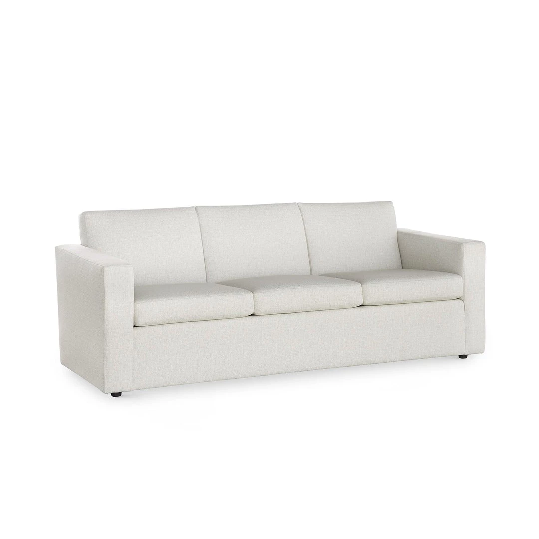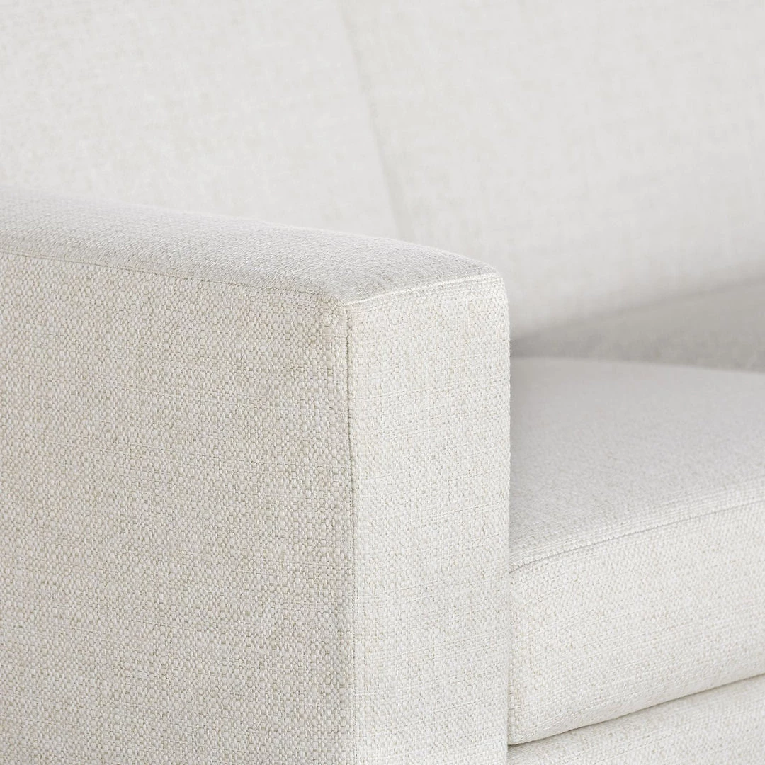 The 83-inch wide Nichols Sofa is made by hand in the USA using kiln-dried solid Maple with sinuous springs. It’s squared cushions, arms, and back feel contemporary and classic. While shown in Kingston Warm White (Fabric No. 1430) fabric, you can choose from any of the upholstery options below.