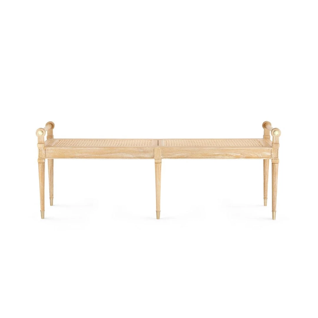 With hand-tied double-layered caning, intricate hand-carved features, and metal accents reminiscent of French antiques, the Paris Bench is ultimately timeless and classic. Bungalow 5’s signature cerused oak process adds a white contrast to the fine details of a wood’s grain, enhancing the beauty and delicate natural patterns of lumber. The bench is available in two different sizes: a smaller version most appropriate for tucking under a bathroom vanity or styling as a pair under an entryway console and a larger version best at the foot of a bed, flanking a dining table or as a convenient place to sit in a big entryway.