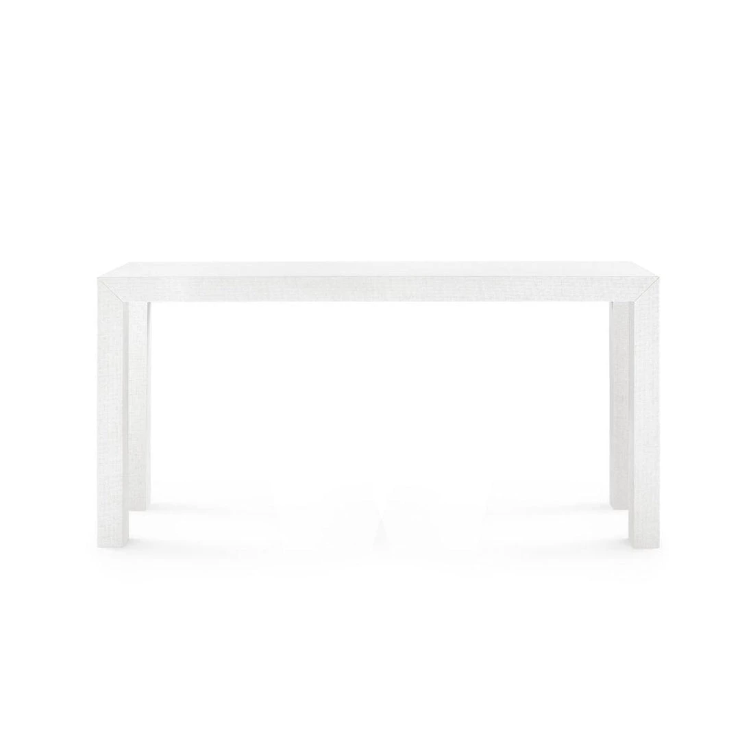The Parsons Collection exemplifies Bungalow 5’s commitment to bringing luxury to life through timeless silhouettes, unique materials, and unmatched craftsmanship. In the Parsons Console Table, a classic shape is reimagined through a contemporary lens, with stout lines and structured proportions giving its pared-down profile a splash of modern personality. In lieu of ornamentation, the piece showcases a sumptuous grasscloth finish in cool white, sealed with lacquer for subtle shine and layered tactility. The Parsons’ sophisticated simplicity and uniform color make it the perfect canvas for personalized decor and display. Dress it up with gilded accents in a lavishly decorated space, or embrace its minimalism for modern schemes. It’s just waiting for your creative touch.