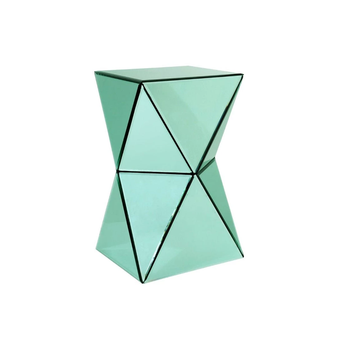 With gemlike geometry and multifaceted shine, the Romano Side Table acts as a functional art piece that adorns your space like a glamorous piece of jewelry. Its nipped-waist silhouette appears like an origami hourglass, featuring angled planes of triangular glass, each one expertly cut and beveled. The colored mirror panels deliver vibrant jewel tones of emerald green with polished edges that capture light and reflect kaleidoscopic shimmer. Fabulously unique, the Romano is a striking accent that can be floated in as a drinks table or fashioned as a permanent fixture in richly decorated rooms. As with most of Bungalow 5’s pieces, you’re sure to hear, “Where did you get that?!”