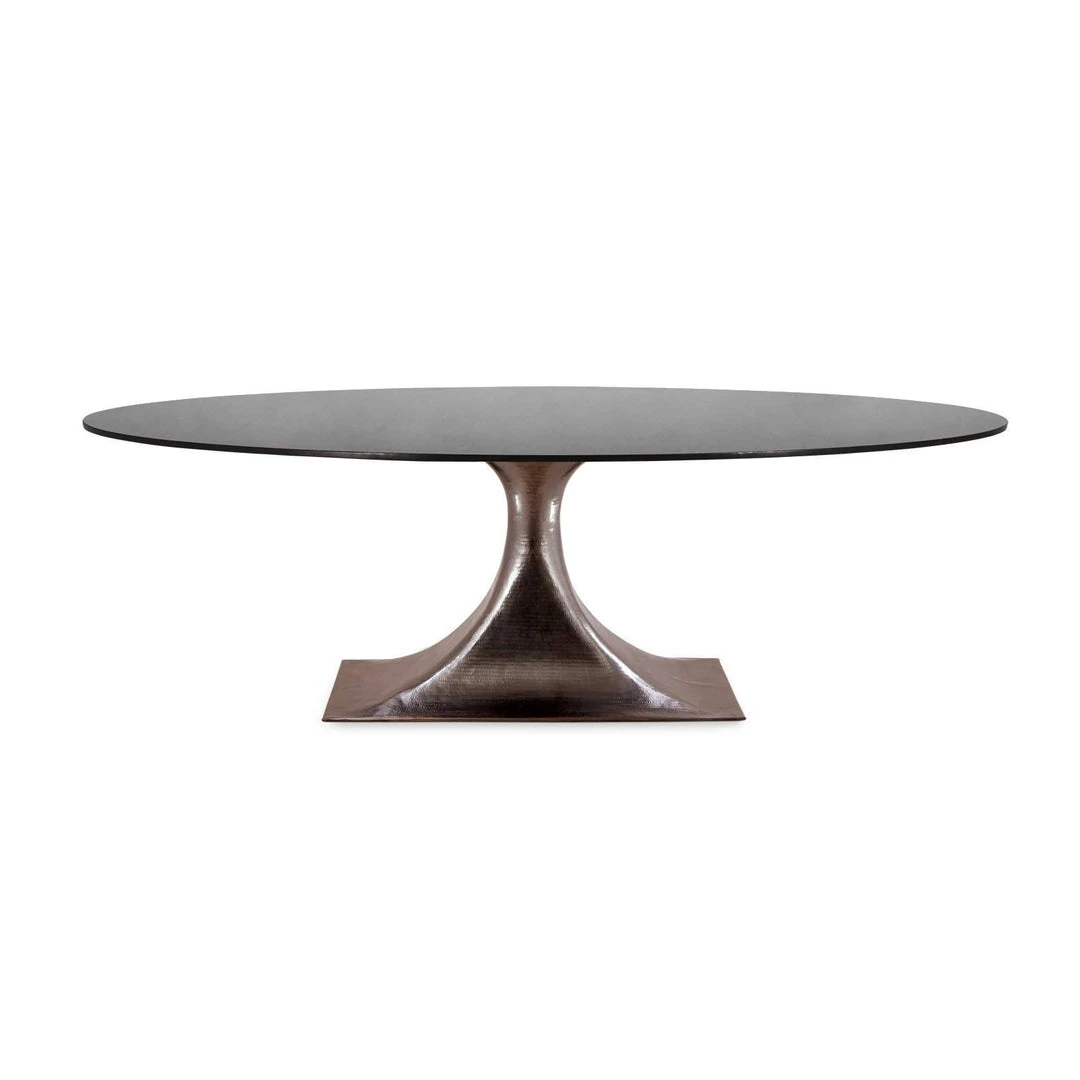 The glorious Stockholm oval dining table has an ancient-modern vibe that reads as Scandinavian in lighter finishes and South American in warmer, darker materials. Mix and match any granite top with a selection of specially hand hammered repoussé bases. The repoussé process forms metal by all-over hammering on the metal’s reverse to yield a crafted, shimmering surface that adds design interest from floor to table top.