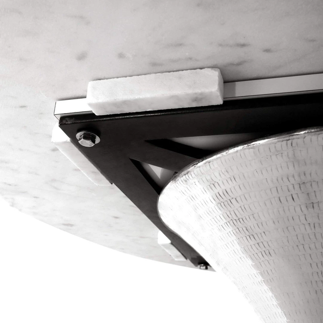 The glorious Stockholm center dining table has an ancient-modern vibe that reads as Scandinavian in lighter finishes and South American in warmer, darker materials. Mix and match any marble top with a selection of specially hand hammered repoussé bases. The repoussé process forms metal by all-over hammering on the metal’s reverse to yield a crafted, shimmering surface that adds design interest from floor to table top.