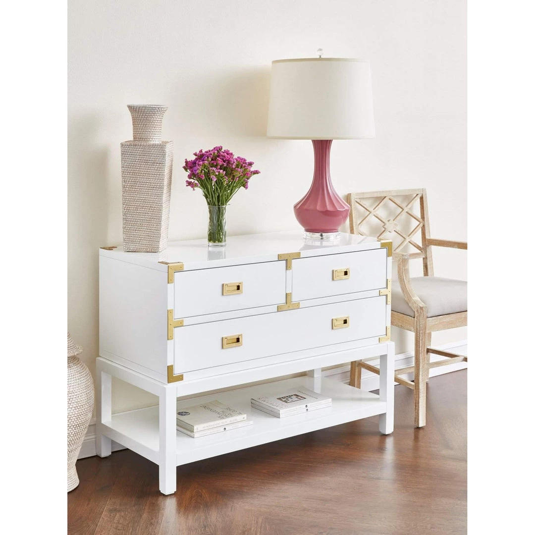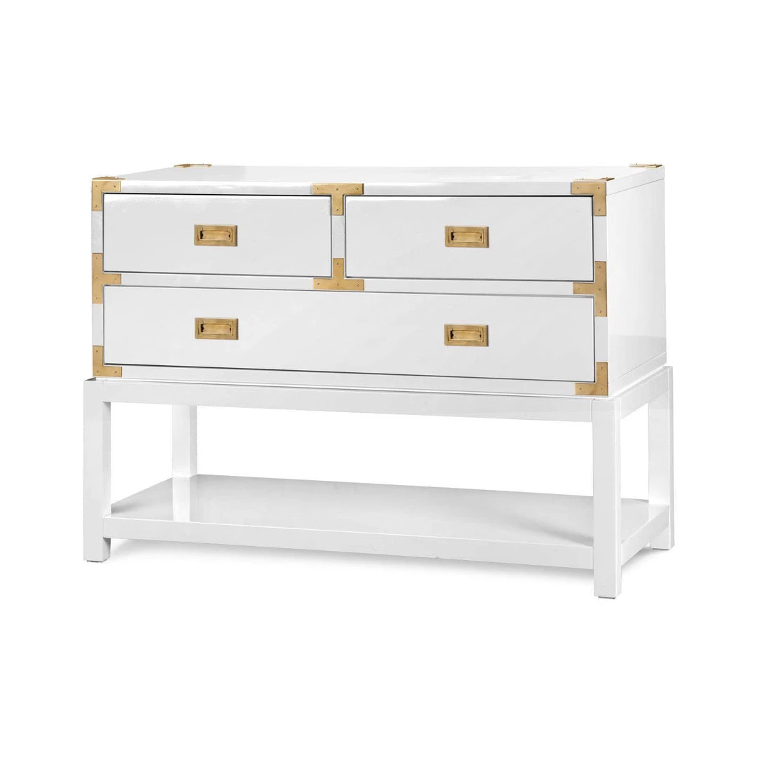 - High Gloss Lacquered Wood, Stained Interior with Full Extension Glides, 1 Fixed Shelf, Polished Brass Handle and Gold Accents.