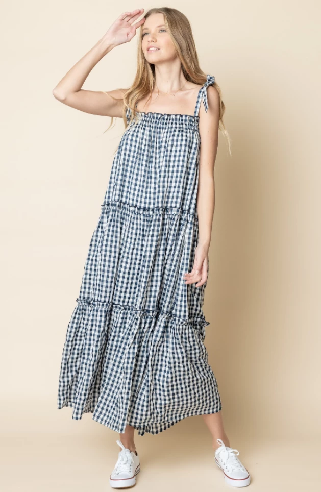 Adjustable tying straps + Tiered seams with ruffles + Lined + Pockets