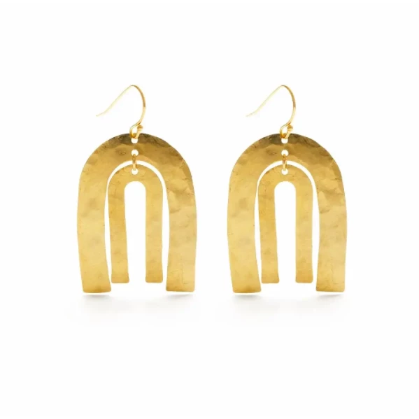 Arco Iris Earrings are made from hammered raw brass and gold fill earwires. They measure approx 1.4″x1″.